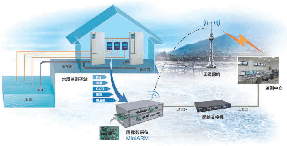 水質(zhì)在線監(jiān)測(cè)預(yù)警裝置:對(duì)環(huán)境數(shù)據(jù)進(jìn)行整合處理,利用GPRS/GSM系統(tǒng)將數(shù)據(jù)傳輸?shù)蕉鄠€(gè)環(huán)境管理部門,并對(duì)各類異常數(shù)據(jù)進(jìn)行實(shí)時(shí)報(bào)警。