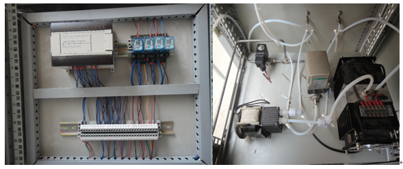本裝置以PLC作為控制中樞,實(shí)現(xiàn)焦?fàn)t煤氣的取樣、反吹、過(guò)濾及O2氣體含量的自動(dòng)分析。當(dāng)“PLC”接收“分析”的指令信號(hào)后,裝置既自動(dòng)執(zhí)行“分析測(cè)量程序”,這時(shí)進(jìn)樣電動(dòng)球閥自動(dòng)打開(kāi),啟動(dòng)取樣真空氣泵,從爐膛或管道中抽出樣氣完成樣氣的采集,樣氣經(jīng)過(guò)伴熱帶沿主流路繼續(xù)完成凈化、脫濕、脫硫等處理,保證進(jìn)入儀器之前的樣氣達(dá)到超凈、恒溫的要求,完成氣體成分的自動(dòng)分析并輸出標(biāo)準(zhǔn)電流信號(hào),根據(jù)程序設(shè)定完成對(duì)爐膛或管道中氣體成分的自動(dòng)檢測(cè)。當(dāng)“PLC”接收“反吹”的指令信號(hào)后,裝置既自動(dòng)執(zhí)行“凈化反吹程序”, 同時(shí)另一路取樣裝置啟動(dòng),這時(shí)進(jìn)樣電動(dòng)球閥自動(dòng)打開(kāi),高壓反吹氣流和震動(dòng)控制對(duì)取樣管路進(jìn)行震動(dòng)及高壓反吹,確保取樣管線(xiàn)通暢。