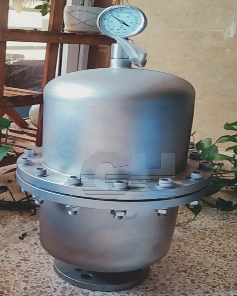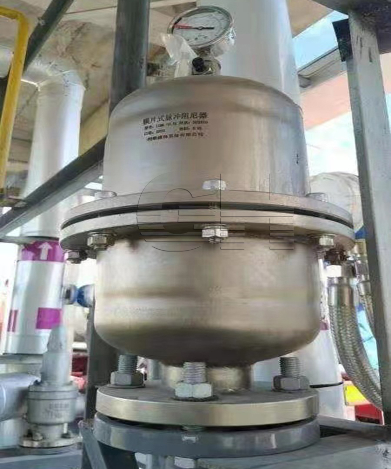 脈沖阻尼器能夠平滑由柱塞泵、隔膜泵等容積泵引起的管路脈動(dòng)及消除系統(tǒng)的水錘現(xiàn)象, 它由耐腐蝕的隔膜將氣體與管路中的液體隔離,通過氣室容積的變化平滑管路脈動(dòng),對(duì)受壓液體的能量進(jìn)行儲(chǔ)存和釋放。