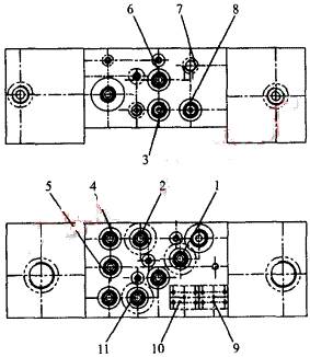 (1.電磁閥 DT3 2.電磁閥 DT2 3.截止閥1 4.截止閥 3 5.截止閥2 6.溢流閥 RV 7.測壓接頭 MP 8.截止閥 4 9.壓力開關(guān) KP2 10.壓力開關(guān) KP1 11.電磁閥 DT1)
