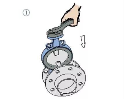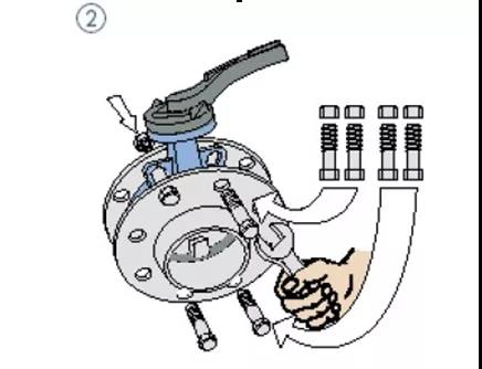1、如所示,將閥門放置于預安裝的兩片法蘭之間,注意螺栓孔要整齊對齊。