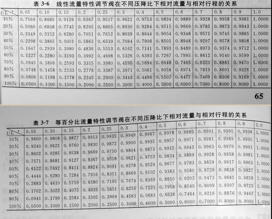 表3-6和表3-7分別是線性流量特性和等百分比流量特性調(diào)節(jié)閥在不同壓降比下相對流量與相對行程的關(guān)系表。