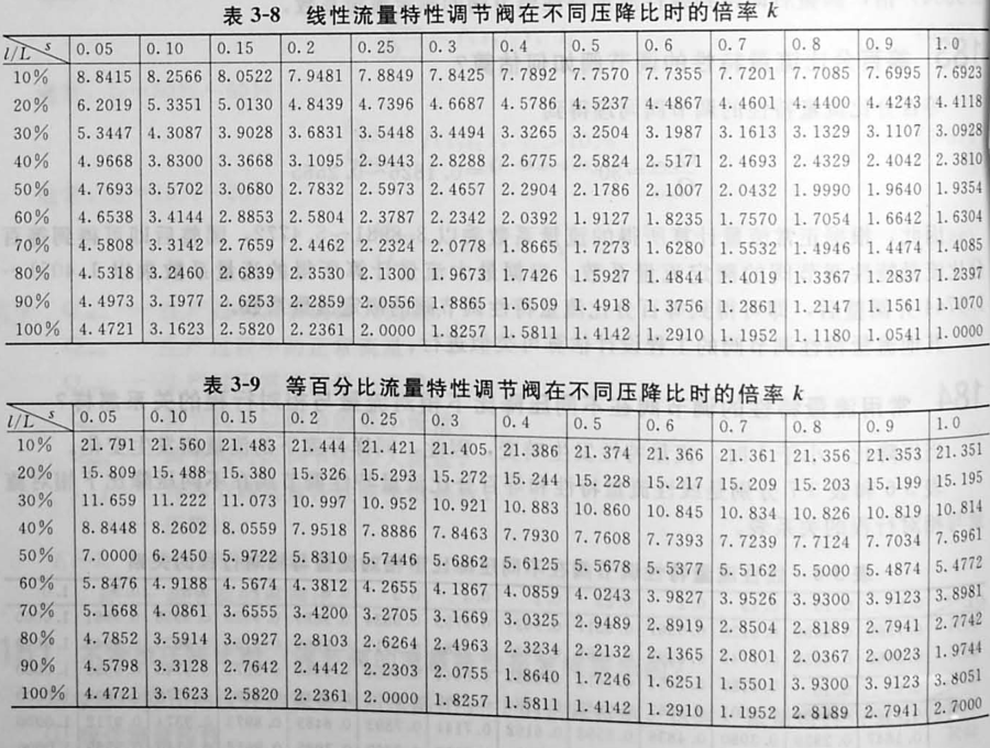 將上述關(guān)系轉(zhuǎn)換到不同開度(相對行程)時的流量與大流量之比,可以獲得相應(yīng)的比值。表3-8和表3-9分別是線性流量特性和等百分比流量特性的調(diào)節(jié)閥在不同壓降比和特定開度下計算的流量系數(shù)Kv1與額定流量系數(shù)Kv之間的倍率k,即Kv=kKv1可以根據(jù)特定開度時的流量乘以相應(yīng)的倍率來確定大流量。