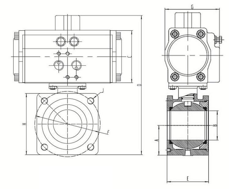 氣動方球閥主要用鑄鐵、不銹鋼、聚四氟乙烯等加工而成。主要結(jié)構(gòu)及連接尺寸如下圖及表