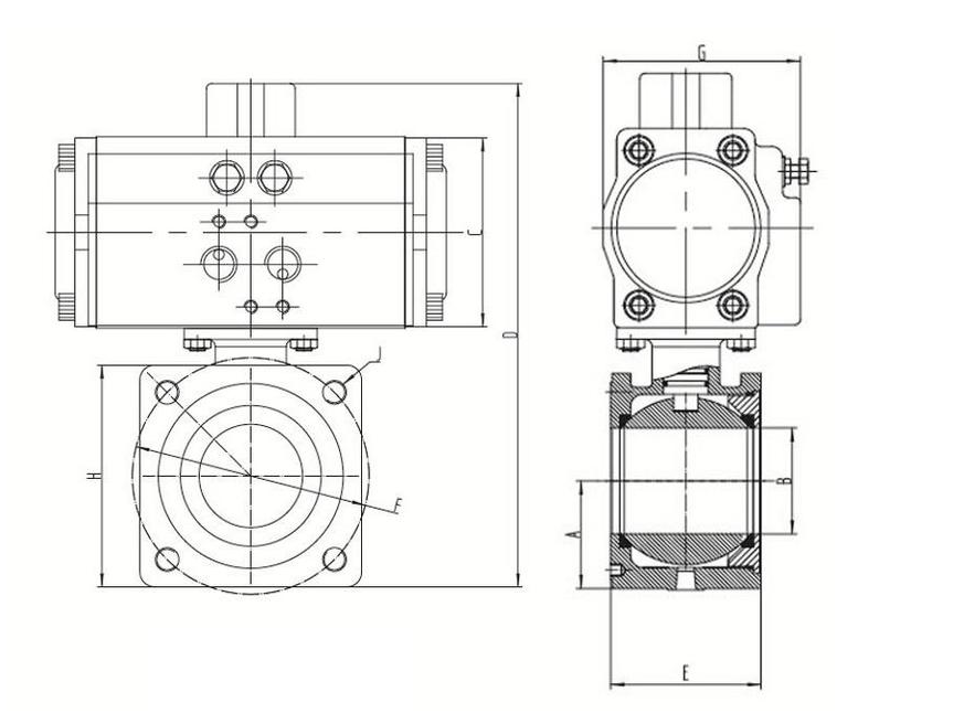 氣動(dòng)方球閥主要用鑄鐵、不銹鋼、聚四氟乙烯等加工而成。主要結(jié)構(gòu)及連接尺寸如下圖及表