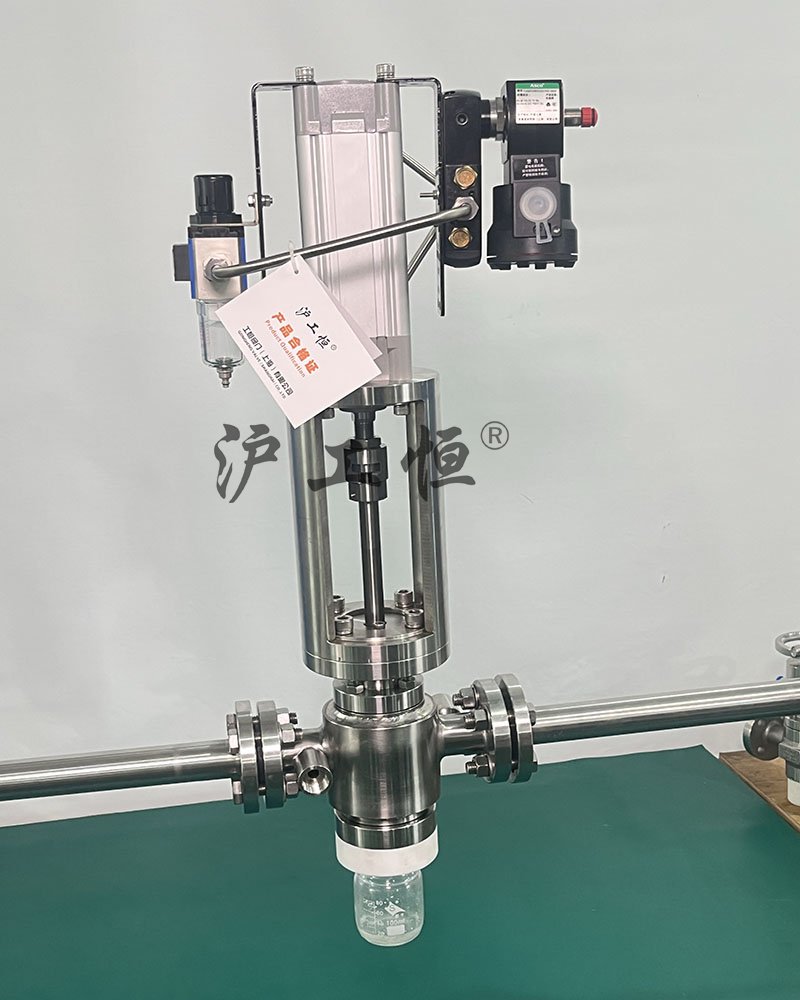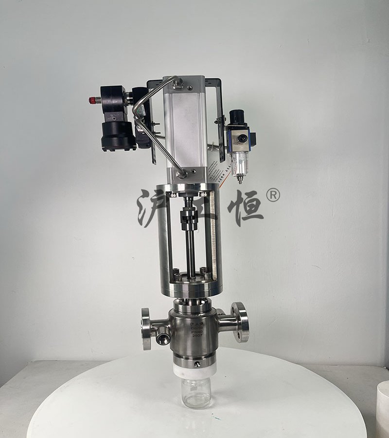 氣動柱塞式定量取樣閥,解決了現(xiàn)有取樣閥的復(fù)雜結(jié)構(gòu),取樣瓶采用PFA材質(zhì),可取樣為腐蝕性介質(zhì),氣動柱塞式定量取樣閥主要有閥體、閥芯、閥桿、閥座、密閉針、帶膜片取樣瓶組成,取樣瓶為可拆卸設(shè)計,試樣從入料針進(jìn)入取樣瓶內(nèi),并通過排氣針排出壓力,使取樣瓶保持在常壓狀態(tài),取樣瓶品裝有橡膠膜可將取樣瓶密封,避免污染試樣,流道無流阻設(shè)計,不影響流量,閥桿通過手柄、電動執(zhí)行機構(gòu)、氣動執(zhí)行機構(gòu)旋轉(zhuǎn)帶動閥桿及閥芯,閥芯上下提拉,可精確控制流量,實現(xiàn)試樣進(jìn)入取樣瓶內(nèi),取樣瓶可選透明和避光兩種,本取樣閥廣泛應(yīng)用在制藥、化工、食品行業(yè)。