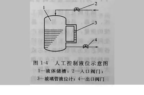 圖1-4所示是人工控制液位示意圖。液體連續(xù)不斷地通過入口閥門2流入儲槽1,同時又不斷地通過出口閥門4流出?梢钥闯,槽內(nèi)液位將隨著流入量或流出量而波動,波動嚴(yán)重時,槽內(nèi)流體可能溢出或抽空。要解決這個問題,使液位保持在某一范圍內(nèi),最簡單的辦法是安裝一個玻璃管液位計(jì)3。以液位計(jì)的上、下限刻度線為標(biāo)準(zhǔn),當(dāng)液位上升到接近上限刻度時,可以開大出品閥門的開度,或關(guān)小進(jìn)口閥門的開度;當(dāng)液位下降到接近下限刻度時,可以關(guān)小出口中閥門或開大進(jìn)口閥門的開度,這樣就避免了儲槽因液位過高而溢流,或因液位下降而抽空的事故發(fā)生,使液位保持在某一范圍內(nèi)。這個過程是由人直接控制的,所以叫人工控制。