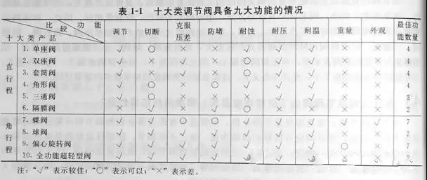 將每種閥具備的九大功能匯總在表1-1中。