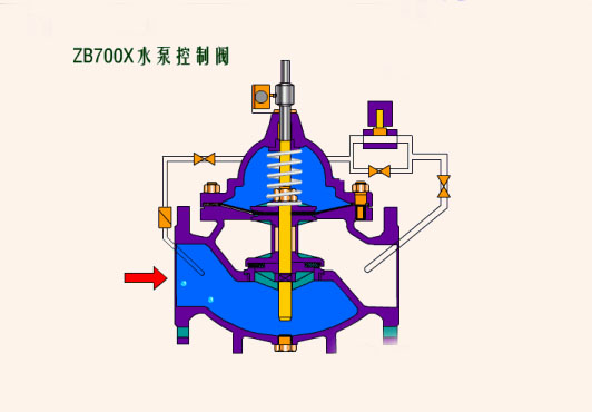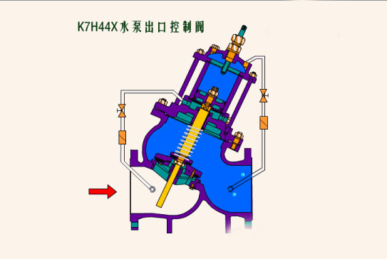 該閥安裝于管路中,主要控制水泵停水時阻止介質逆流,并阻止因介質逆流所產(chǎn)生的水錘,保證水泵停泵,當水泵工作時,電磁閥通電處于關閉狀態(tài),主閥上控制室內的壓力水經(jīng)出口處單向閥流向下游,主閥瓣處于輕松工作中,當開始停泵時,主閥瓣再回流水的作用下快速關閉百分之九十,主控制室內的壓力水由進口端補給,此時電磁閥的在形成開關的控制失電下被打開,控制內的壓力水由出口端緩慢補給,從而使主閥瓣的剩余百分之十開度緩慢關閉,破壞性水錘。