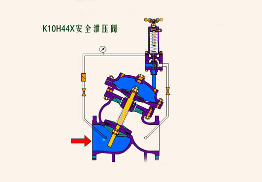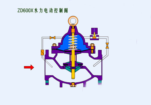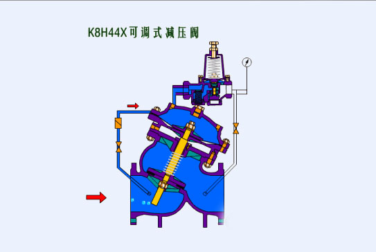 該閥安裝在管道中,主要將上游壓力水解壓到規(guī)定的下游壓力,保證下游用水,根據(jù)需要下游壓力事先在導閥上設定好,當下游壓力低于設定值時,導閥在彈簧的作用下打開,主閥上控制控制室內的壓力水經(jīng)導閥流向下游,控制室內的壓力減一,住閥瓣在上游水的作用下打開,向下游大量供水,當壓力升高至設定值時,導閥關閉,控制室內壓力升高,閥門關閉。
