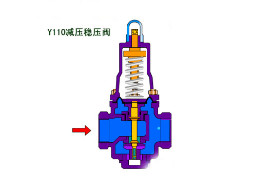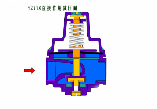 該閥安裝于管路中,主要穩(wěn)定出口壓在設定范圍,保證出口壓力不因進口壓力的變化而變化,當出口壓力低于設定值時,閥瓣在彈簧力的作用打開,水流通過,當出口壓力升至設定值時,出口壓直接傳遞于膜片下方,與彈簧形成使閥瓣關閉,切斷通水。