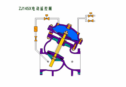 該閥在管路中,人為遠距和就地遙控開啟或關閉,控制管內介質流通或切斷,當需要打開閥門時,事先打開啟動按鈕,電磁閥通電打開,主閥控制室內壓力水,經(jīng)電磁閥流向出口,控制室內壓力降低,主閥瓣打開,開始大量通水,當點擊停止按鈕,電磁閥失電而關閉,主閥室內壓力升高,主閥瓣關閉,水流停止。