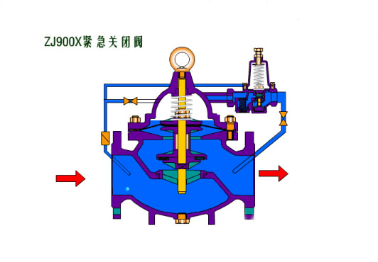 該閥主要應用于工礦企業(yè),生活用水,消防用水的并聯(lián)供水系統(tǒng)中,在緊急消防用水時,切斷生活用水,保證消防正常用水壓力。當消防系統(tǒng)需要用水時,打開閥門進口處球閥,同時關閉出口處的球閥,進口壓力直接進入導閥控制室,使導閥關閉,主閥室內的壓力升高,使主閥關閉,切斷下游的生活用水,當消防結束后,打開出口處的球閥,同時關閉進口處的球閥,生活用水恢復正常。