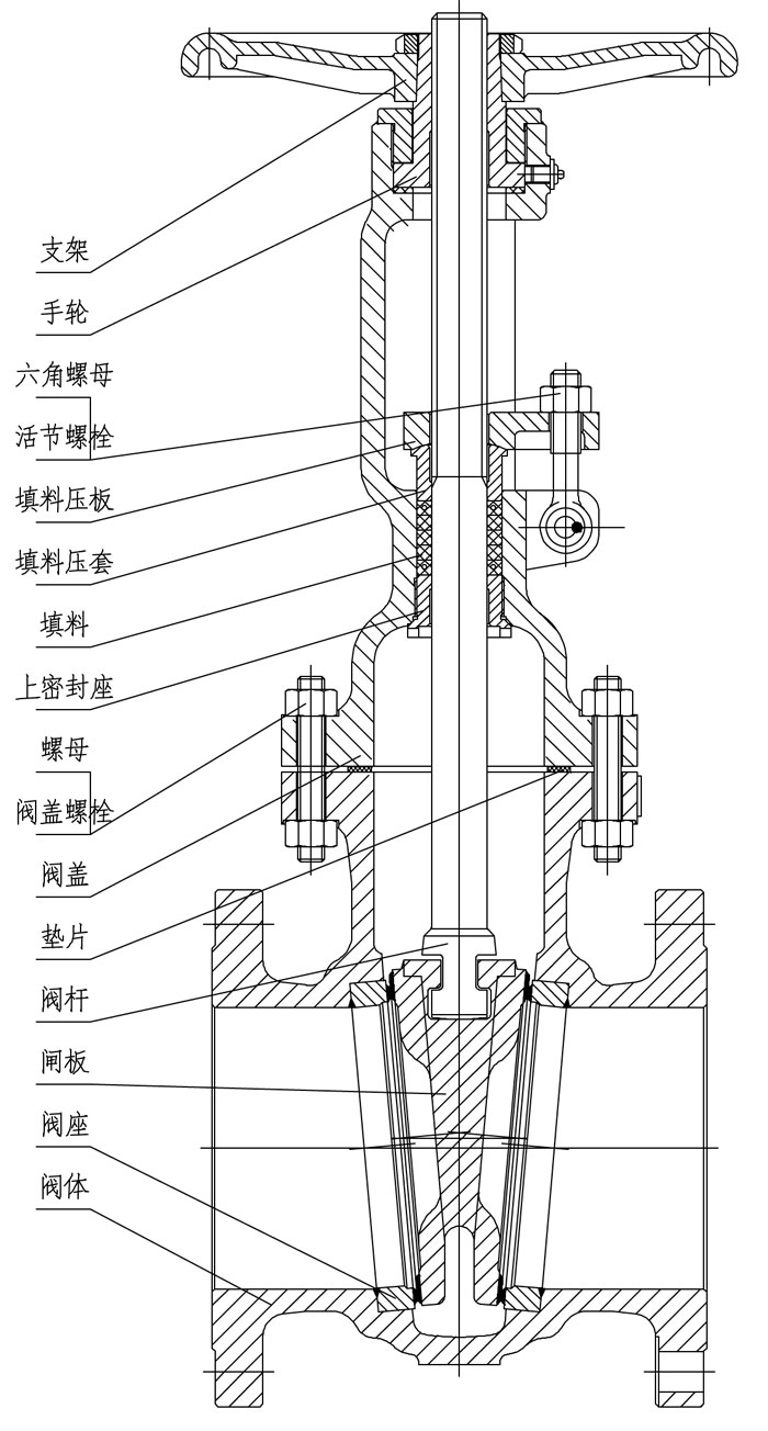 閘閥主要由閥體、閥蓋、支架、閥桿、閥桿螺母、閘板、閥座、填料函、密封填料、上密封座、填料壓蓋及傳動裝置等零件組成。主要零部件名稱如下圖: